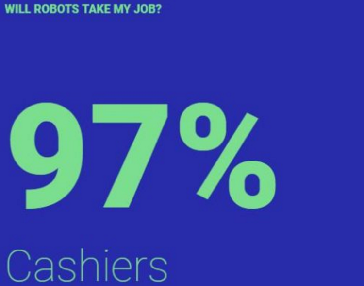 打開(kāi)網(wǎng)站后,輸入要查找的職業(yè)名稱(chēng)(英文),比如說(shuō)cashier(收銀員), 網(wǎng)站會(huì)顯示,有97%機(jī)率可能在未來(lái)被機(jī)器人取代,底下會(huì)有說(shuō)明,為什么這個(gè)職業(yè)可能未來(lái)會(huì)面臨失業(yè)的風(fēng)險(xiǎn),包括有電子掃描器、收銀機(jī)和相關(guān)設(shè)備能處理信用卡和現(xiàn)金卡,以及各種其他支付方式,使用人工收付款方式可能會(huì)日漸減少。將網(wǎng)頁(yè)向下拖曳,可看到被自動(dòng)化工具取代的風(fēng)險(xiǎn)層級(jí)非常大。收銀員年收入中位數(shù)為 2 萬(wàn)美金左右,目前就業(yè)人口有三百五十萬(wàn)人,當(dāng)然這是美國(guó)市場(chǎng)的統(tǒng)計(jì)結(jié)果。