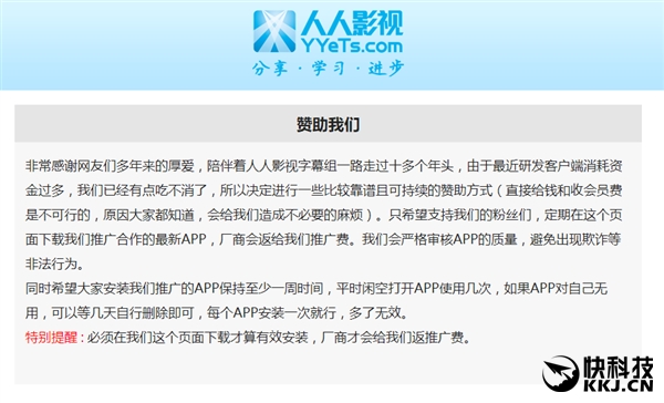 人人影視今晚通過官方網(wǎng)站、微博發(fā)帖發(fā)帖稱“人人影視需要您的幫手”,并透露這大半年來一直在努力開發(fā)客戶端,但是太燒錢了,已經(jīng)把儲備金揮霍一空。