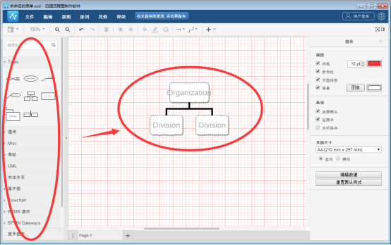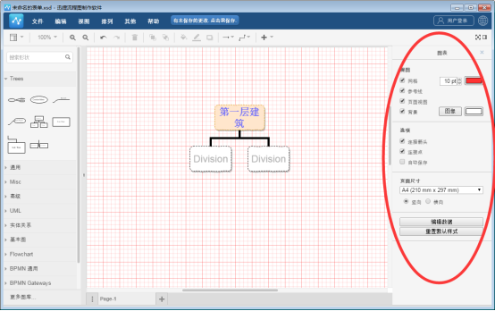 選擇圖形素材并對整個流程圖繪制完整后,我們還可以對配景進行修改。選中配景部分后,在右側(cè)的“圖表”版塊中,可以選擇是否需要網(wǎng)格、參考線等內(nèi)容,以及對配景顏色進行設(shè)置。