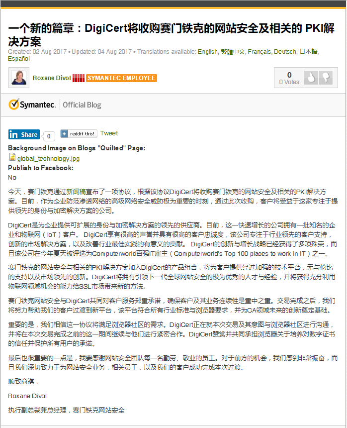 近日,賽門鐵克頒布頒發(fā)了一項并購協(xié)議,按照該協(xié)議DigiCert將收購賽門鐵克的網站安適業(yè)務及相關的PKI解決方案。DigiCert是為企業(yè)提供可擴展身份與加密解決方案的領先供應商,與賽門鐵克合作后,兩者將共同為用戶提供一個增強的技術平臺、前所未有的支持資源和領先于市場的創(chuàng)新技術,將最大程度滿足行業(yè)相關尺度及瀏覽器的要求。