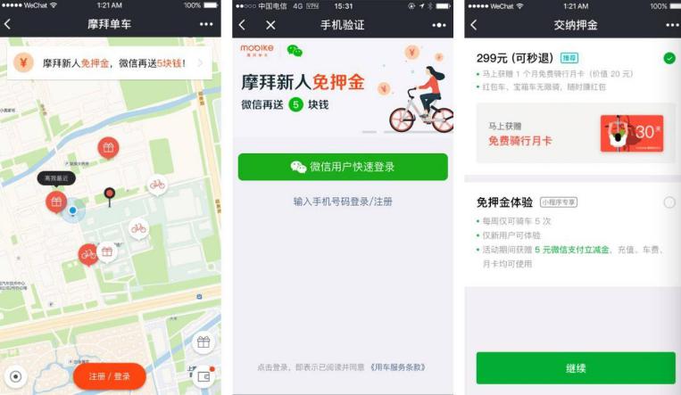 在結合小程序的場景下,微信的高覆蓋率將使得摩拜的使用成本趨于零,尤其對于一些擔憂押金的新用戶來說,免下載、免押金的低門檻能夠大大提升新用戶的嘗鮮概率,降低新用戶使用摩拜單車的門檻。