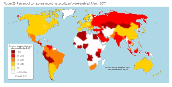 如果以國家和地區(qū)來看,歐洲受到安適軟件掩護的Windows電腦占比最高,其中芬蘭高達92%,而俄羅斯、蒙古以及非洲、拉美一些國家則是重災(zāi)區(qū)。