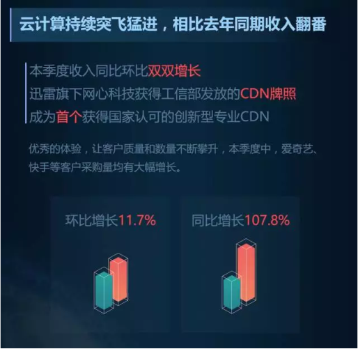 這已是迅雷云計(jì)算業(yè)務(wù)連續(xù)8個(gè)季度高速增長(zhǎng)。自2015年第三季度實(shí)現(xiàn)收入以來(lái),迅雷云計(jì)算業(yè)務(wù)就一直奔騰在快車道上,每個(gè)季度均連結(jié)至少兩位數(shù)的增長(zhǎng)率,最高時(shí)曾單季同比增長(zhǎng)131%。