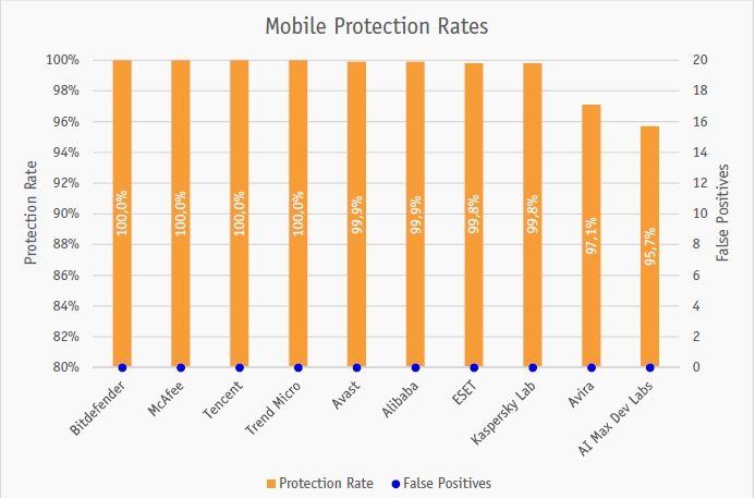 此次AV-C測試中,主要針對惡意軟件的查殺、防盜、掩護隱私、攔截惡意網(wǎng)址和文件備份這六大功能,對 10 款安適軟件進行測試。病毒防護方面,騰訊手機管家對 4081 個樣本實現(xiàn)100%的識別查殺率和零誤判。在電池消耗方面,騰訊手機管家在內(nèi)的大部分軟件消耗都小于3%,麥卡菲(Mcafee)和趨勢(Trend)則延續(xù)去年情況,電池消耗較大。
