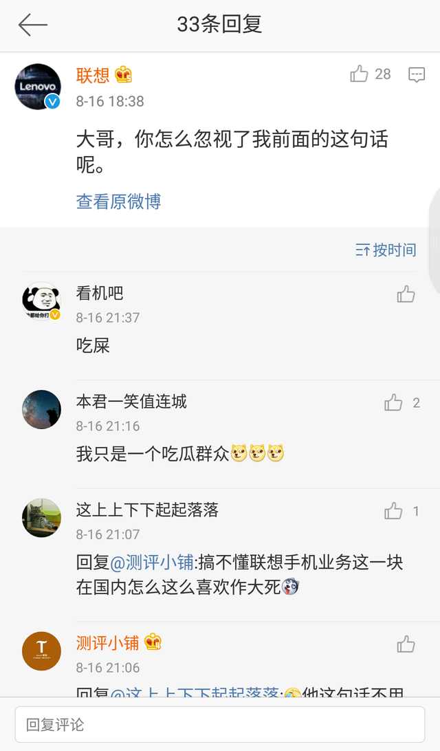 這條評論真的不像是一家企業(yè)的官方微博發(fā)出來的,雖說聯(lián)想可能是為了拉近與用戶的距離,但未須要通過譏諷和調(diào)侃的友商的方式來太高本身。隨后聯(lián)想官方可能也覺得這樣做不太安妥,刪除了這條微博,但努比亞官方微博的下方評論中,聯(lián)想又評論了一句。