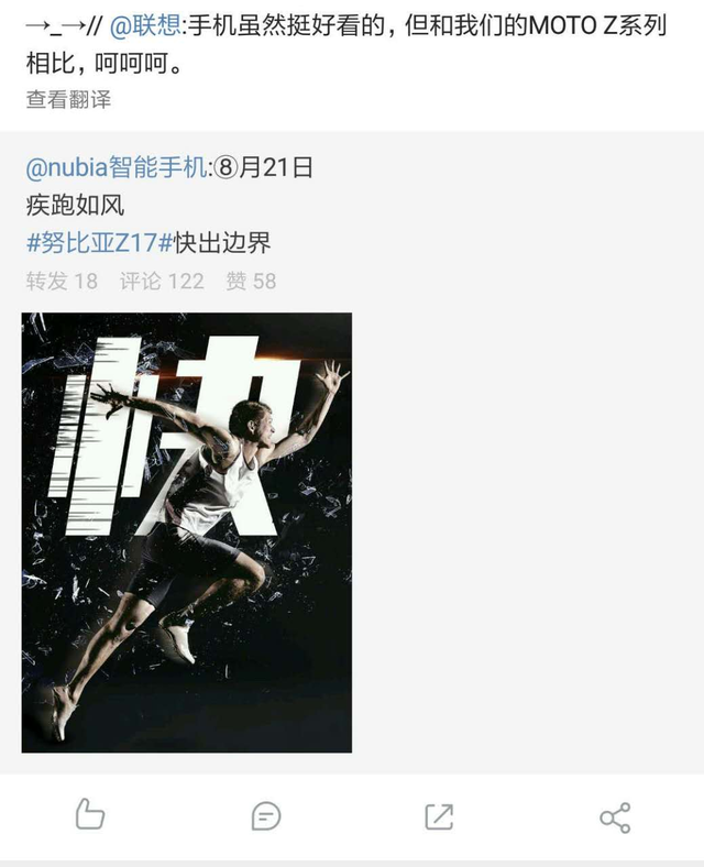 比來聯(lián)想官方微博做了一件事情,就是以個(gè)人身份調(diào)侃另一家手機(jī)品牌的新機(jī),這家手機(jī)品牌就是中興旗下的子品牌努比亞。前兩天努比亞發(fā)出公告,將于 8 月 21 日在北京召開努比亞Z17 新品發(fā)布會,關(guān)鍵詞是“快出界限”,而聯(lián)想官方微博在努比亞的這條微博轉(zhuǎn)發(fā)并回復(fù)道:“手機(jī)雖然挺好看的,但和我們的MOTO Z系列比擬,呵呵呵?!?/p>