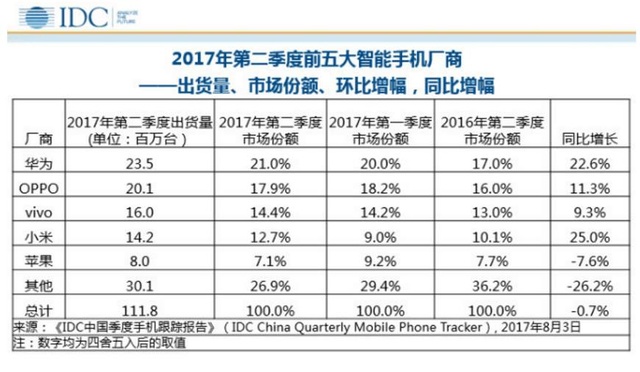 在IDC日前發(fā)布的中國季度手機(jī)跟蹤陳訴中,華為、OPPO、vivo、小米、蘋果等排名前五的手機(jī)品牌在本年第二季度拿走了超過70%的市場份額,留給“其他”一欄的僅剩26.9%,而這個數(shù)字在上個季度還是29.4%,去年第二季度的時候占比達(dá)到36.2%。