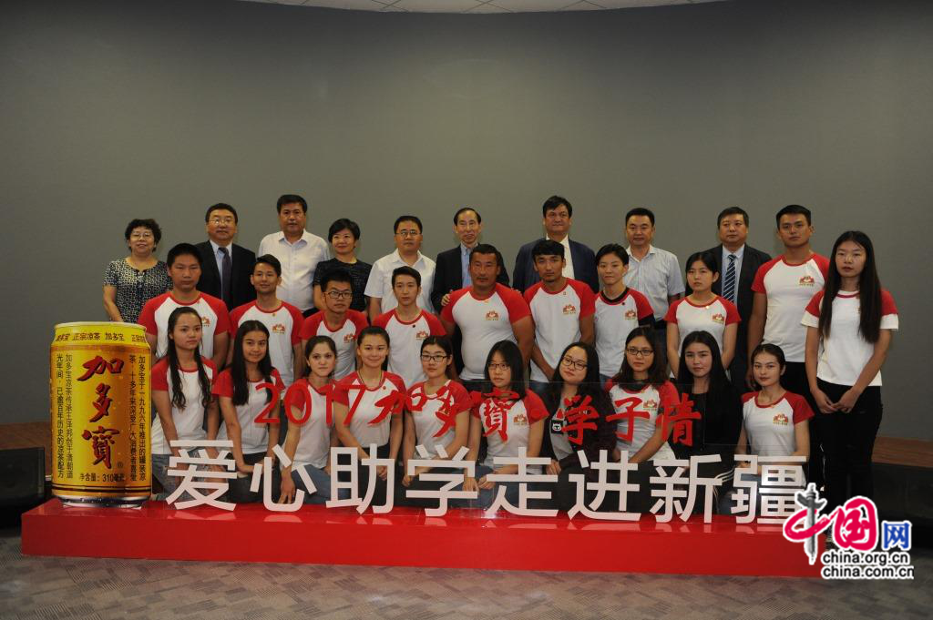 8 月 15 日(烏魯木齊), 2017 年“加多寶·學(xué)子情”公益助學(xué)行動(dòng)走進(jìn)了新疆,在當(dāng)天的活動(dòng)儀式上,中國愛心工作委員會(huì)攜愛心企業(yè)——加多寶集團(tuán)捐款 100 萬元用于幫助新疆維吾爾自治區(qū) 200 名寒門學(xué)子圓夢(mèng)大學(xué)。全國政協(xié)外事委員會(huì)委員、中國國際文化傳播中心執(zhí)行主席、中國愛心工作委員會(huì)主席龍宇翔,新疆維吾爾自治區(qū)教育廳副巡視員戢廣南,中國愛心工作委員會(huì)副主席艾米爾·依米提,新疆財(cái)經(jīng)大學(xué)黨委副書記阿里木·亞可夫,新疆財(cái)經(jīng)大學(xué)副校長姜錫明及加多寶集團(tuán)董事長助理李曉瑩,受助學(xué)生代表和媒體記者共百余位嘉賓出席了捐助儀式。