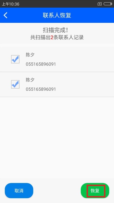 5.查看完成之后,將需要進(jìn)行恢復(fù)的聯(lián)系人進(jìn)行點(diǎn)擊勾選,然后即可點(diǎn)擊下方的綠色“恢復(fù)”按鈕,將誤刪的聯(lián)系人找回在手機(jī)上。
