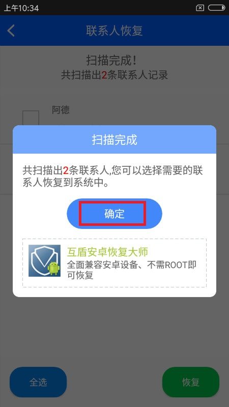 4.掃描結(jié)束后,軟件界面即可彈帶有掃描信息的提示框,點(diǎn)擊其中的“確定”按鈕,就可進(jìn)入對(duì)刪除的聯(lián)系人進(jìn)行點(diǎn)擊查看。