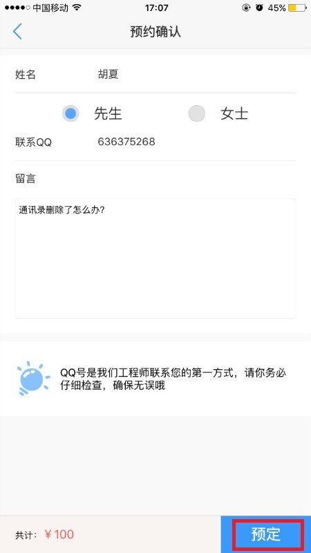 4.接下來(lái)我們需要對(duì)預(yù)訂的具體信息進(jìn)行填寫,這里大家必然要將信息進(jìn)行認(rèn)真的填寫,信息填寫完成之后,點(diǎn)擊下方的“預(yù)訂”進(jìn)入。