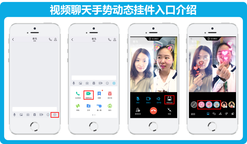 “視頻掛件”已經(jīng)成為年輕人社交中比較常用的娛樂功能,新版本手機(jī)QQ通過AI識別技術(shù)與動(dòng)態(tài)掛件功能相結(jié)合,實(shí)現(xiàn)多人視頻通話、短視頻錄制添加手勢動(dòng)態(tài)掛件。用戶在視頻通話,或者錄制短視頻時(shí)可以通過靜態(tài)手勢觸發(fā)動(dòng)態(tài)掛件特效,如:對準(zhǔn)屏幕作出比心的動(dòng)作后,屏幕中會(huì)飄出一系列的小愛心,目前視頻聊天和短視頻同時(shí)支持比心和手掌手勢,此外,短視頻還支持托手手勢。手勢動(dòng)態(tài)掛件為用戶的視頻社交帶來更多趣味玩法,也將用戶“心情”從面部延展到雙手,,提供更多元的溝通方式。