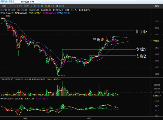 按照國內(nèi)知名的數(shù)字資產(chǎn)交易平臺OKCoin幣行的數(shù)據(jù)顯示,以太坊開盤價1993.89,最高價2059.00,最低價1950.00,收盤報于1996.00.截止收盤上漲0.15%,振幅5.59%。今日以太坊開盤價1996.98,基本平開。日內(nèi)來看,價格正在高位形成收斂三角形整理形態(tài),顛簸空間逐步收窄,目前仍未選擇標的目的,交投于2000附近。