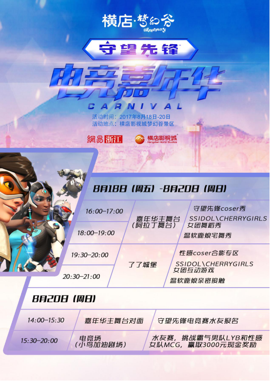 2017 橫店夢幻谷守望先鋒電競嘉年華將于 8 月18- 20 日,在橫店影視城夢幻谷景區(qū)舉行。本次電競嘉年華活動由網(wǎng)易浙江與橫店影視城聯(lián)合主辦???,趕緊隨小編一起來看看本次嘉年華有哪些亮點吧!