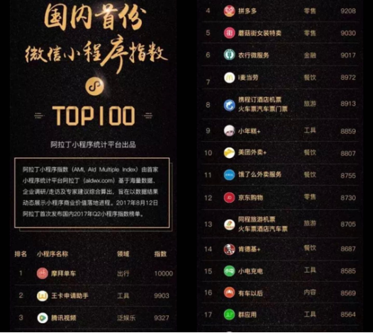隨著微信小程序作為新物種的紅利發(fā)作,摩拜小程序成為與App并重的流量入口,據(jù)阿拉丁統(tǒng)計(jì)平臺(tái)發(fā)布《國(guó)內(nèi)首份微信小程序TOP100榜單》顯示摩拜小程序占據(jù)第一,此前押金為299元的摩拜突然把推行“免押金”試騎,勢(shì)必讓摩拜小程序連結(jié)其頭部?jī)?yōu)勢(shì)。