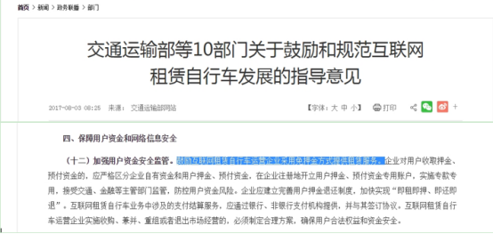 國(guó)務(wù)院于8月1日出臺(tái)《交通運(yùn)輸部等10部門關(guān)于鼓勵(lì)和規(guī)范互聯(lián)網(wǎng)租賃自行車發(fā)展的指導(dǎo)意見》,摩拜、ofo在官微第一時(shí)間亮相擁護(hù)“單車新政”,其中第十二條“加強(qiáng)用戶資金安適監(jiān)管”中提到了“鼓勵(lì)互聯(lián)網(wǎng)租賃自行車運(yùn)營(yíng)企業(yè)采用免押金方式提供租賃辦事”?!把航稹睔v來是互聯(lián)網(wǎng)租賃自行車備受關(guān)注的點(diǎn),甚至有自媒體質(zhì)疑單車是“流動(dòng)儲(chǔ)蓄銀行”。新政明確強(qiáng)調(diào)企業(yè)要“嚴(yán)格區(qū)分自有資金和用戶押金、預(yù)付資金”,實(shí)施(押金)??顚S?,接受交通、金融等主管部門的監(jiān)管。