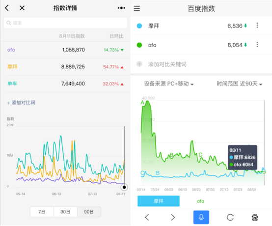 當(dāng)前ofo發(fā)力在改裝智能鎖,摩拜頓時(shí)加大補(bǔ)助力度,對(duì)ofo新增用戶釜底抽薪。按照近90天微信指數(shù)顯示,摩拜在微信端一直大幅領(lǐng)先ofo,甚至在8月11日摩拜的品牌詞竟超過了“單車”的品類詞;別的在近90天的百度指數(shù)顯示,一直在輿論聲量上處于攻勢(shì)的ofo在8月份被摩拜小幅度反超。