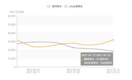 在APP使用時(shí)長(zhǎng)方面,QuestMobile最新數(shù)據(jù)顯示,從 6 月 5 日至 11 日— 7 月 17 日至 23 日,摩拜單車APP的周使用時(shí)長(zhǎng)從 23819 萬(wàn)分鐘增長(zhǎng)至 31851 萬(wàn)分鐘,增幅為34%;ofo則從 29241 萬(wàn)分鐘下滑至 18459 萬(wàn)分鐘,降幅為37%。一升一降中,摩拜單車領(lǐng)先后者73%。