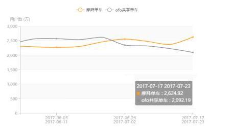 易不雅觀數(shù)據(jù)則顯示,在APP日啟動(dòng)次數(shù)單月走勢(shì)( 6 月 21 日— 7 月 21 日)中,摩拜單車從 1863 萬(wàn)增長(zhǎng)至 2411 萬(wàn),增幅為29%;ofo小黃車從 2666 萬(wàn)下滑至 1281 萬(wàn),降幅為52%。