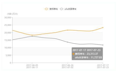 QuestMobile數(shù)據(jù)顯示,在APP使用次數(shù)方面,從 6 月 5 日至 11 日— 7 月 17 日至 23 日的雙月走勢(shì)來(lái)看,摩拜單車周APP使用次數(shù)從 18269 萬(wàn)次增長(zhǎng)至 23313 萬(wàn)次,增幅為28%;ofo則從 17443 萬(wàn)次下滑至 11727 萬(wàn)次,降幅為33%。摩拜領(lǐng)先99%。
