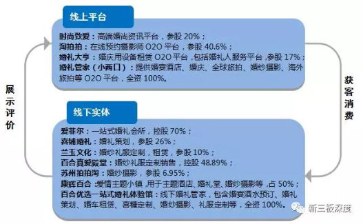 目前,百合網(wǎng)已經(jīng)控股小兩口和愛菲爾,參股喜鋪婚禮、蘭玉婚紗等知名婚禮相關(guān)品牌,同時(shí)擁有多家線上婚嫁信息平臺和線下婚嫁辦事供應(yīng)商,基本覆蓋婚禮辦事行業(yè)大部分細(xì)分領(lǐng)域。