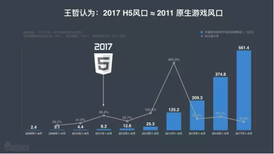 這張數(shù)據(jù),上個月伽馬數(shù)據(jù)和IDC發(fā)布的,圖中藍色的柱形表示了國內(nèi)手機原生游戲在每年1~6月份的市場規(guī)模,而折線則代表了同比增長率。我們可以看到手機原生游戲在今年上半年已經(jīng)是一個561億規(guī)模的龐然大物,但同比增長率50%,則是2011年以來的最低點,注意,是6年以來的最低點。