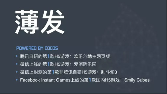 基于這樣的趨勢判斷,Cocos引擎做了什么呢?很多業(yè)內(nèi)朋友都說我很低調(diào)。是啊我的作風是比較低調(diào)的,錢都砸在引擎研發(fā)里面了,時間都花在論壇和微信里當客服了。讓我砸錢在市場宣傳上,呵呵,舍不得啊。在今年,我們做了很多實事。用Cocos引擎開發(fā)的H5游戲,數(shù)量上可能不多,但我們占據(jù)了國內(nèi)H5游戲所有的里程碑事件: