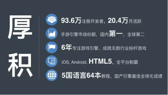 截止7月底,Cocos引擎已經(jīng)積累了93萬的注冊開發(fā)者,20萬的月活躍用戶,在移動游戲的通用引擎領域,市場占有率國內(nèi)第一,全球第二,而且遠遠甩開全球第三名7倍的市場份額。