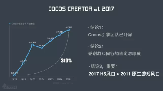 感謝游戲同行對Cocos Creator的肯定與厚愛,但我覺得Creator的使用量能暴漲,主要原因還是我們今天就站在H5游戲的風口上了。