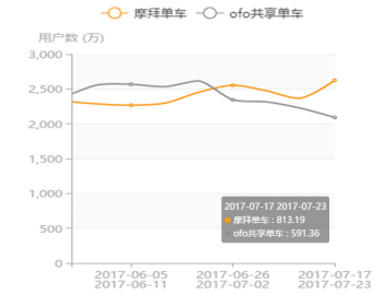 在 7 月 17 日至 23 日周日均活躍用戶量數(shù)據(jù)上,摩拜為 813 萬(wàn),ofo則為 591 萬(wàn),摩拜領(lǐng)先38%。在周日均活躍用戶量雙月走勢(shì)即 6 月 5 日至 11 日到 7 月 17 日至 23 日中,摩拜從 659 萬(wàn)增長(zhǎng)至 813 萬(wàn),增幅為23%,ofo從 839 萬(wàn)下滑至 591 萬(wàn),降幅為30%。