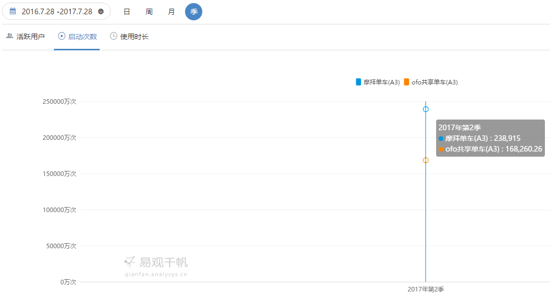 易不雅觀數(shù)據(jù)顯示,在 2017 年第二季度終,APP季度啟動(dòng)次數(shù)摩拜為 238915 萬(wàn)次,ofo則為 168260 萬(wàn)次,摩拜領(lǐng)先42%。