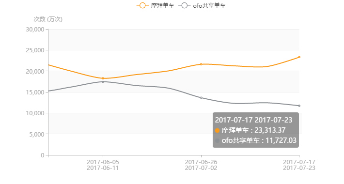 QuestMobile數(shù)據(jù)顯示,在 7 月 17 日至 23 日周使用次數(shù)數(shù)據(jù)上,摩拜為 23313 萬(wàn)次,ofo為 11727 萬(wàn)次,摩拜領(lǐng)先99%。在周使用次數(shù)雙月走勢(shì)即 6 月 5 日至 11 日到 7 月 17 日至 23 日中,摩拜從 18269 萬(wàn)次增長(zhǎng)至 23313 萬(wàn)次,增幅為28%,,ofo則從 17443 萬(wàn)次下滑至 11727 萬(wàn)次,降幅為33%。