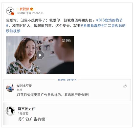 蘇寧易購在 818 高潮來臨之際,聯(lián)合二更推出這樣一則視頻,在強(qiáng)化品牌心智的同時(shí),也是為了配合整個(gè) 818 發(fā)燒購物節(jié)的節(jié)奏。