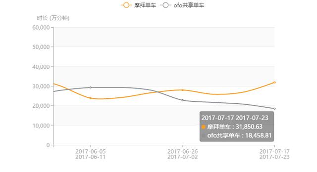 7 月 17 日至 23 日,摩拜周使用時長為 31851 萬分鐘,ofo為 18459 萬分鐘,摩拜領(lǐng)先73%。