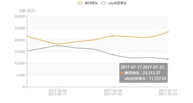 6 月 5 日至 11 日~ 7 月 17 日至 23 日,摩拜單車周使用次數(shù)雙月走勢從 18269 萬次增長至 23313 萬次,增幅為28%,ofo小黃車從 17443 萬次下滑至 11727 萬次,降幅為33%。