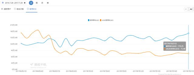 6 月 21 日~ 7 月 21 日,摩拜APP日使用時長從 123 萬小時增長至 170 萬小時,增幅為38%,ofo從 172 萬小時下滑至 75 萬小時,降幅為56%。