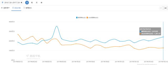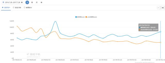6 月 21 日~ 7 月 21 日,摩拜單車APP日啟動次數(shù)單月走勢從 1863 萬增長至 2411 萬,增幅為29%,ofo小黃車從 2666 萬下滑至 1281 萬,降幅為52%。