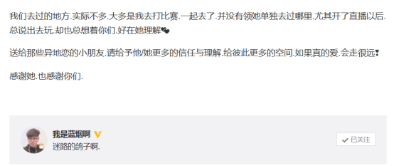 藍(lán)煙微博寫給女伴侶的一封信,信里秀出了他們一起去過很多地方的機(jī)票、高鐵票,但是無奈的是,因為角逐時間緊張,大部分時間都只是陪著去僅此罷了,沒有好好逛一逛。而現(xiàn)在,作為當(dāng)年戰(zhàn)隊豪門夢魘戰(zhàn)隊的主力,實力已經(jīng)足夠應(yīng)對直播需要,多余的時間都可以賠償女伴侶!