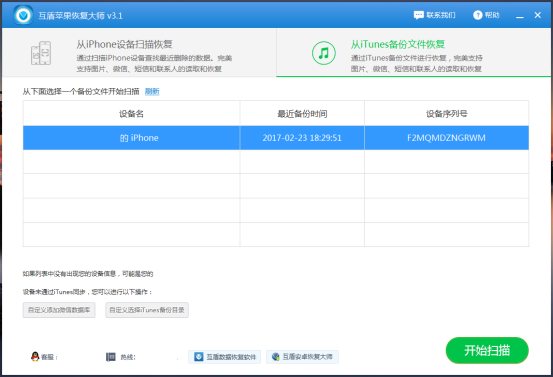 第二步:用數(shù)據(jù)線將需恢復(fù)微信聊天記錄的蘋果手機(jī)連接到電腦上,第一次將蘋果手機(jī)接入電腦,需下載iTunes進(jìn)行數(shù)據(jù)備份,按照提示操作即可。運(yùn)行互盾蘋果恢復(fù)大師軟件,我們會(huì)看到“從iPhone設(shè)備掃描恢復(fù)”“從iTunes備份文件恢復(fù)”兩個(gè)選擇,之前對(duì)蘋果手機(jī)進(jìn)行過(guò)iTunes數(shù)據(jù)備份,我們則直接點(diǎn)擊“從iTunes備份文件恢復(fù)”的“開(kāi)始掃描”按鈕。