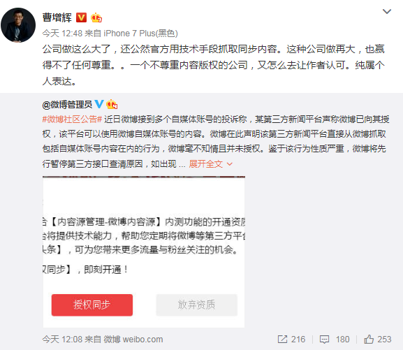 微博副總裁曹增輝發(fā)文稱其通過技術(shù)突破微博防線,并稱“這種公司做的再大,也博得不了任何尊重?!?/p>