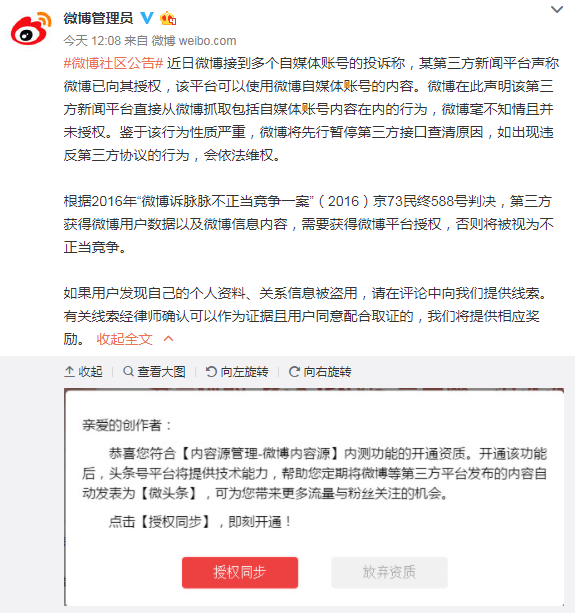 昨日( 8 月 10 日)中午十二點,微博官方公布了一則社區(qū)公告,稱某第三方新聞平臺在微博毫不知情、并未授權(quán)的情況下直接從微博抓取自媒體賬號的內(nèi)容,鑒于其行為性質(zhì)嚴重,微博先行暫停了第三方接口,并體現(xiàn)將會依法維權(quán)。