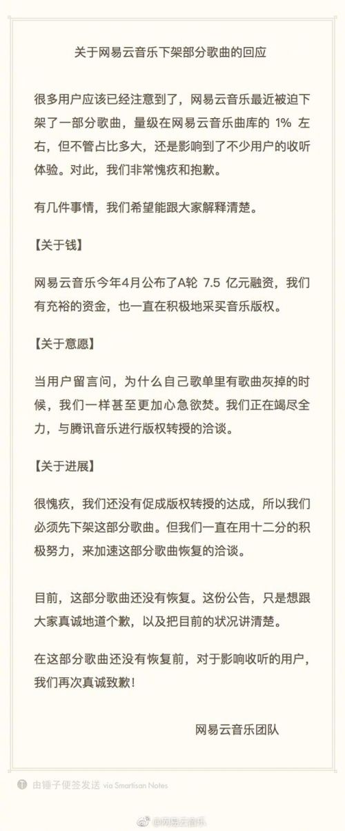 巨人網(wǎng)絡(luò)通訊聲明:本文標(biāo)題《網(wǎng)易云音樂回應(yīng)下架歌曲:正和騰訊洽談版權(quán)轉(zhuǎn)授》,本文關(guān)鍵詞 網(wǎng)易,云,音樂,回應(yīng),下架,;如發(fā)現(xiàn)本文內(nèi)容存在版權(quán)問題,煩請?zhí)峁┫嚓P(guān)信息告之我們,我們將及時(shí)溝通與處理。本站內(nèi)容系統(tǒng)采集于網(wǎng)絡(luò),涉及言論、版權(quán)與本站無關(guān)。