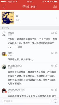 網易云音樂用戶@凍餖腐寫道:“三歲時,你說讓我等你五分鐘; 二十三歲時,你卻還沒回來;爸,我現在不要馬路對面的冰糖葫蘆了?!兜取贰薄6@樣走心又扎心的故事,在《等》的評論區(qū)里還有很多。