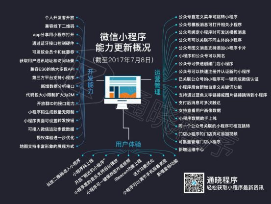 雖然微信官方火力全開,不停地更新開放微信小程序的各項功能權(quán)限,鞭策小程序的發(fā)展,但還是有很多人還是會問,微信小程序究竟有哪些應(yīng)用場景?哪些行業(yè)適合做小程序?開發(fā)和運營小程序可以使用哪些高效的工具?為了讓開發(fā)者和創(chuàng)業(yè)者們對小程序有更深刻的認(rèn)識和了解,「通曉程序」從小程序能力更新概況、小程序開發(fā)與運營、小程序熱門行業(yè)、優(yōu)秀案例、小程序資訊與資源五個方面整理了一份白皮書,幫手大家看懂微信小程序誕生后的整個生態(tài)布局。