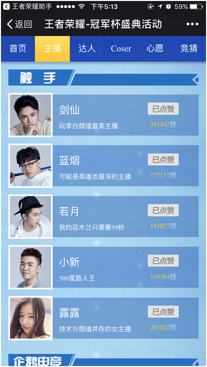 如果要評選當前的王者峽谷大忙人,非觸手直播《王者榮耀》“一哥”劍仙莫屬,騰訊爸爸的活動邀請一個接著一個,人氣和曝光也是直線上升!繼昨天曝光的和若月一起,疑似和小米合作解說QQ空間王者星聯(lián)賽,今天再登《王者榮耀助手》暑期盛典“集結(jié)人氣主播”,而且目前以 38 萬的高點贊數(shù),遠超其他平臺所有主播位居第一!