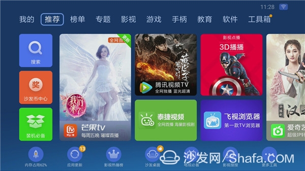 搭載全新πOS,首屏即可自定義個(gè)性入口隨意添加本身喜歡的應(yīng)用和頻道,形成習(xí)慣越用越便利,同時(shí)采用更加扁平化的界面設(shè)計(jì),下拉式的菜單更符合用戶的瀏覽習(xí)慣;頻道分區(qū)簡(jiǎn)潔直不雅觀,家里白叟小孩都能輕松找到本身喜愛的內(nèi)容,此系統(tǒng)是基于安卓6.1深度優(yōu)化,支持安置各類諸如沙發(fā)管家類的電視軟件。