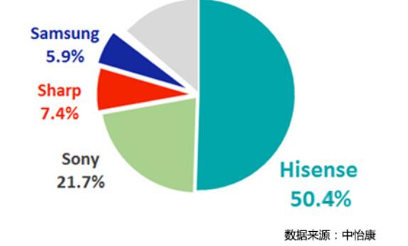 在 80 吋以上的電視產(chǎn)品中,共計(jì)覆蓋 12 個(gè)品牌 41 個(gè)產(chǎn)品。其中,,海信 4 個(gè)型號(hào)的激光電視產(chǎn)品在 6 月市場(chǎng)占有率達(dá)到50.4%,超過(guò)了以索尼(21.7%)、三星(5.9%)、夏普(7.4%)為主的外資“3S”品牌市場(chǎng)占有率總和。 超大屏市場(chǎng)已經(jīng)形成海信激光電視“一足鼎立”的格局,1- 6 月,海信激光電視累計(jì)額占有率為40.9%,同比增長(zhǎng)346.7%;激光電視 “爆款”效應(yīng)開(kāi)始顯現(xiàn):6 月,市場(chǎng)每賣出兩臺(tái) 80 吋及以上的大屏電視,就有 1 臺(tái)來(lái)自海信。