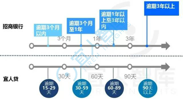 銀行業(yè)在逾期期限劃分方面,尺度相對(duì)趨于一致,如招商銀行按照自身貸款業(yè)務(wù)情況,將逾期貸款分為:逾期 3 個(gè)月以?xún)?nèi)、逾期 3 個(gè)月至 1 年內(nèi)、逾期 1 年以上至 3 年以?xún)?nèi)、逾期 3 年以上四類(lèi)貸款。