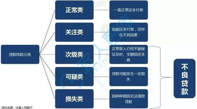 在中國(guó)人民銀行貸款監(jiān)管五級(jí)分類(lèi)制度下,銀行業(yè)貸款分為正常類(lèi)、關(guān)注類(lèi)、次級(jí)類(lèi)、可疑類(lèi)、損失類(lèi),其中次級(jí)、可疑及損失類(lèi)的貸款都屬于不良貸款。各家銀行基本都根據(jù)相同的尺度,將各自的貸款進(jìn)行分類(lèi)。