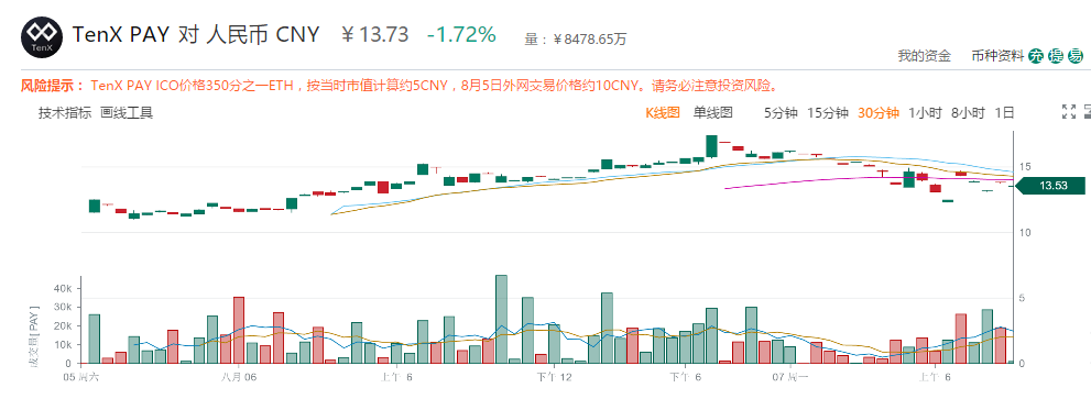 TenX PAY于 8 月 5 日晚 7 點(diǎn)在比特兒bter交易平臺開通交易,ICO階段成本約在4. 5 元,上線之后漲幅即刻超過45%,今日價(jià)格維持在 13 元擺布。